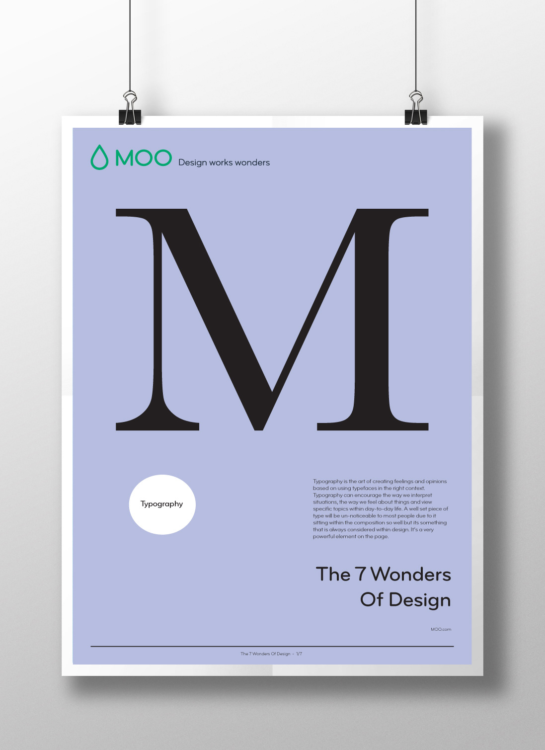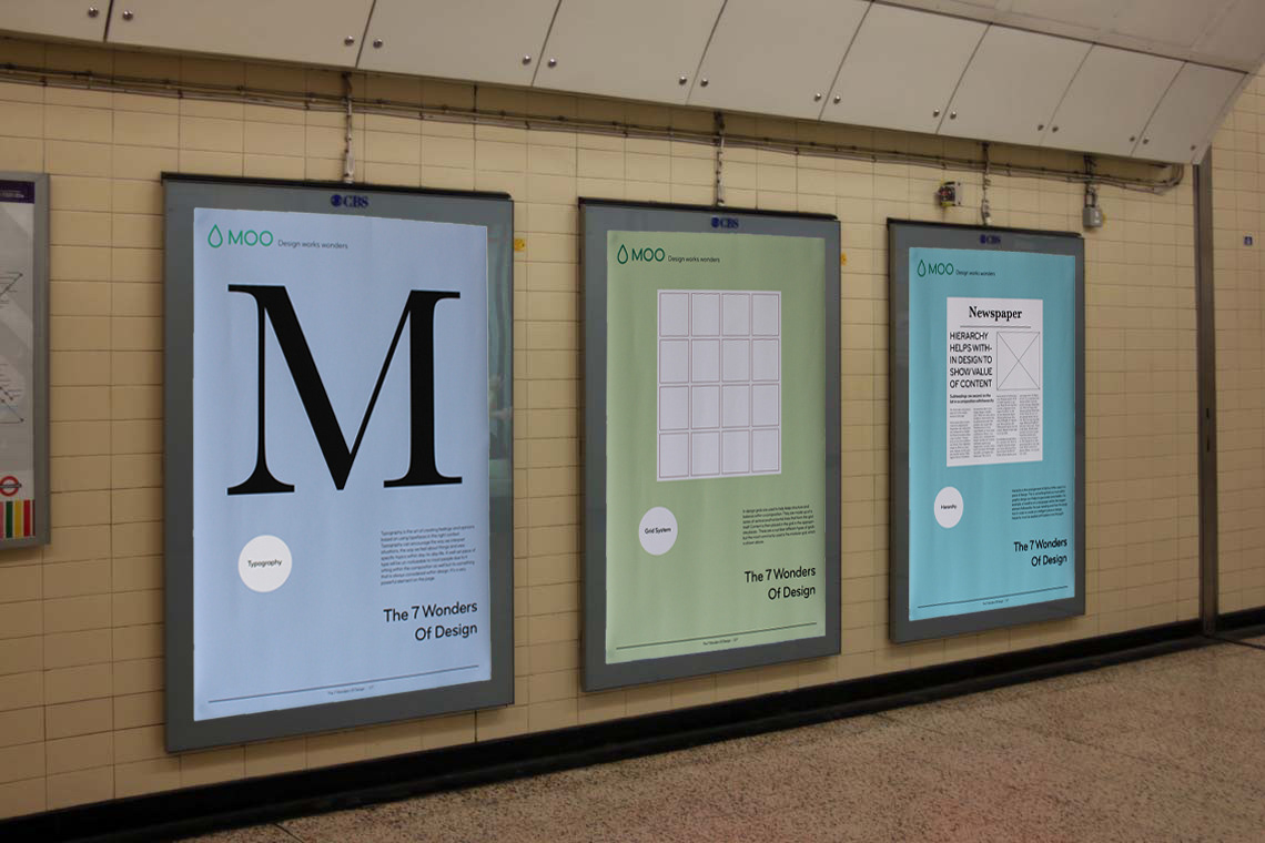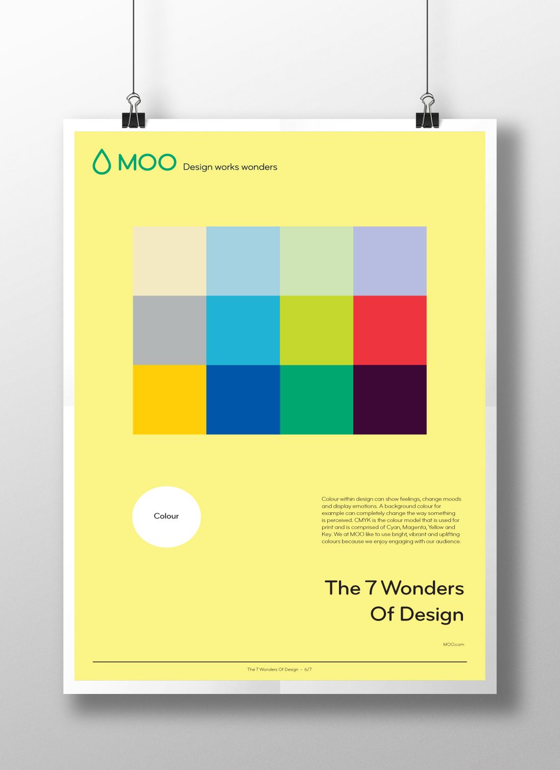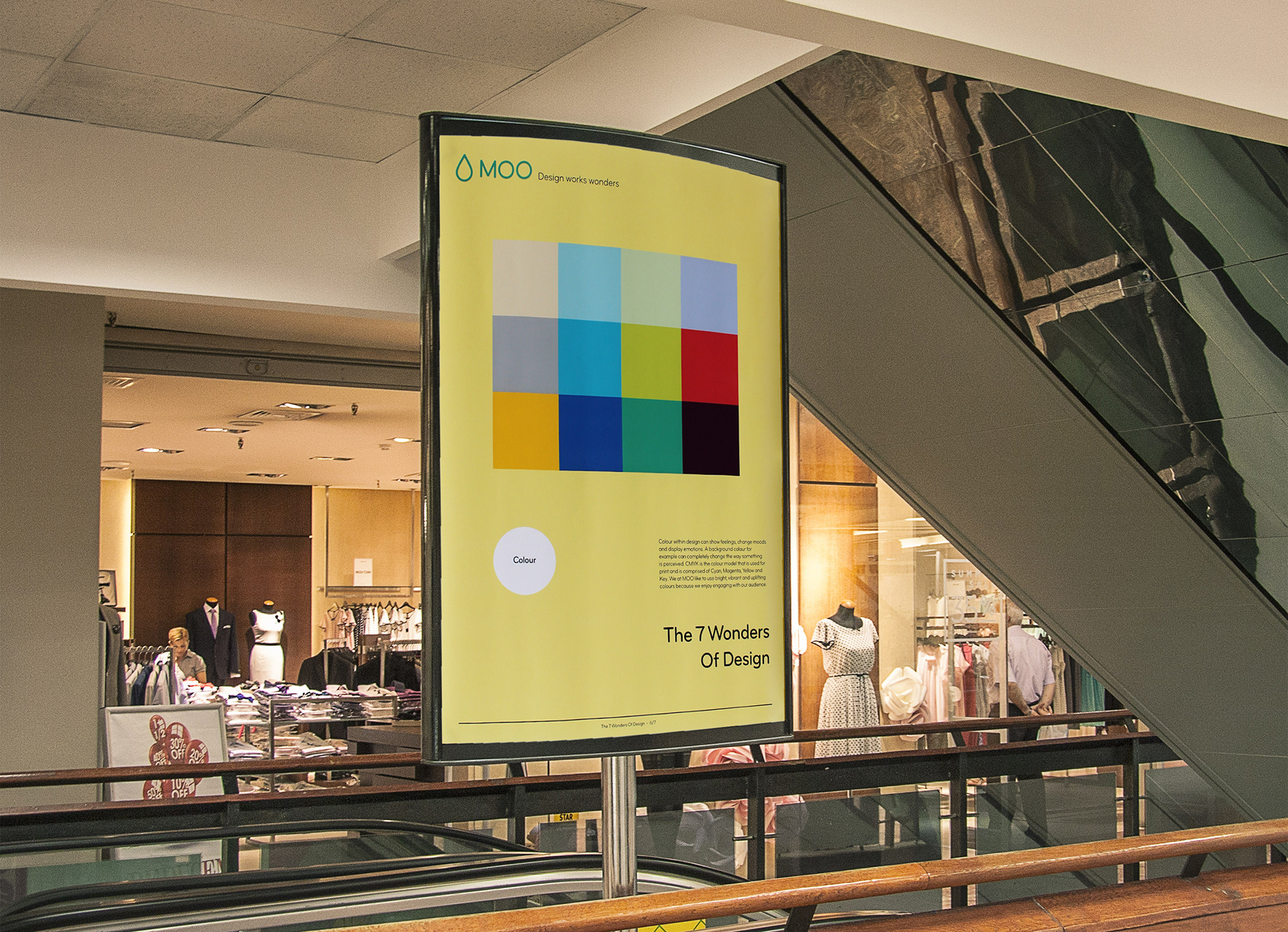 At the time of this project, MOO had just changed their tagline to ‘Design Works Wonders’, which is also their company's philosophy towards design. In order to raise awareness of this philosophy I was asked to create a visual representation of ‘Design Works Wonders’. This was the first project I had taken on in which I had to stick to brand guidelines. I produced a set of posters that included six of the most obvious, yet also most important components of graphic design and for the seventh poster, I put the six elements together to form one poster. The reason I chose seven posters in which to fill this brief was a play on the '7 wonders of the world'.
